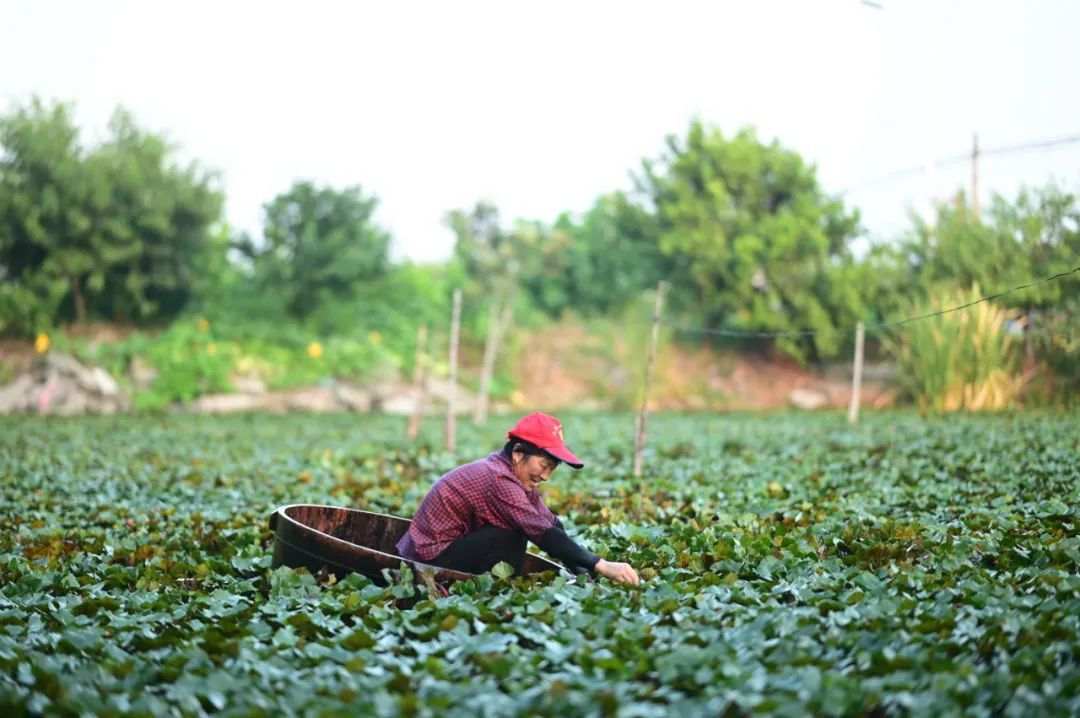昨天,记者在通北村看到,家家门前的菱塘里菱叶碧绿,村民姜凤珍正穿梭在一簇簇碧叶间采摘菱角。只见她动作娴熟轻巧,在摘下成熟菱角后,再将植株放回水中。很快,身下的大水盆就放满了新鲜采摘的菱角。