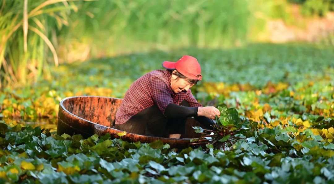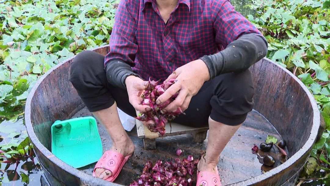 姜凤珍种植菱角已有15年,今年她种植了两亩红菱。她向记者介绍,种植红菱的方法既简单又有讲究。放养的水域,底下要有一定的淤泥,通常清明前后将种菱抛撒在水里生根发芽,中秋前就可采摘菱角,到九月重阳节时已是采菱的旺季。