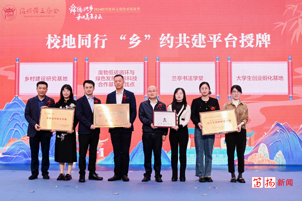 近年来,王坛镇积极搭建校地同行 “乡”约共建平台,与浙江农业商贸职业学院、浙江工业大学之江学院、浙江工商大学环境与科学学院、绍兴文理学院兰亭书法艺术学院合作成立了乡村建设研究基地、大学生创业孵化基地、“废物低碳循环与绿色发展国际科技合作基地”实践点、兰亭书法学堂等多个基地点位。开幕式上,四所高校、学院相关负责人集中为王坛镇进行授牌。