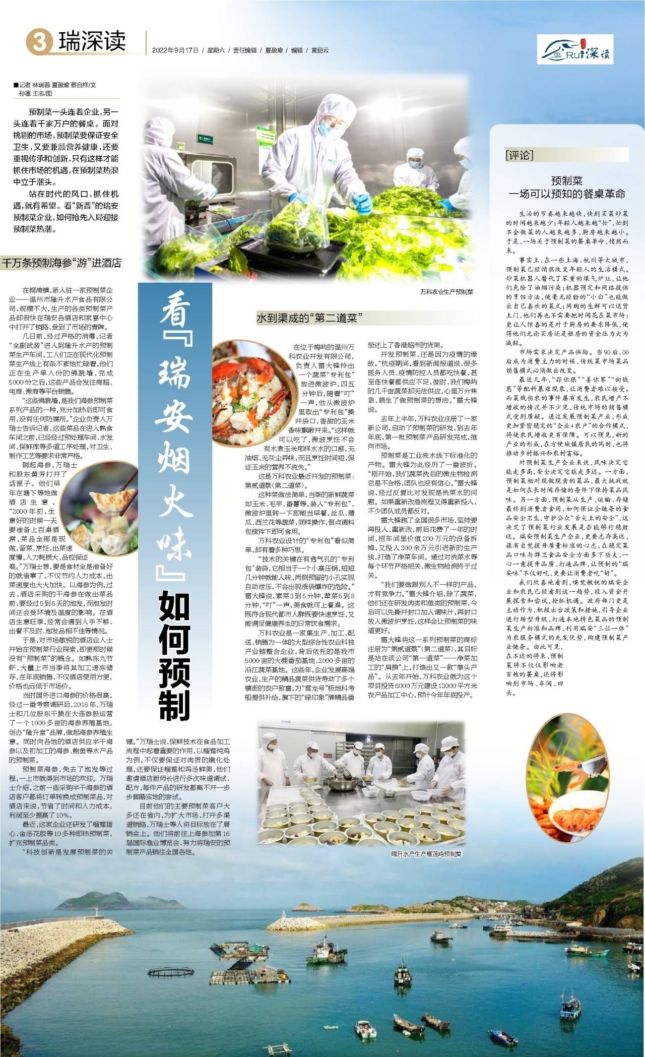 我们欣喜地看到,嗅觉敏锐的瑞安企业和农民已经看到这一趋势,投入资金开展探索和尝试,抢抓机遇。政府部门更是主动作为,积极出台政策和措施,引导企业进行转型升级,打造本地特色菜品的预制菜生产标准和品牌,利用瑞安“三位一体”为农服务模式的先发优势,构建预制菜产业链条。由此可见,在不远的将来,预制菜将不仅仅影响老百姓的餐桌,还将影响到市场、车间、田头。