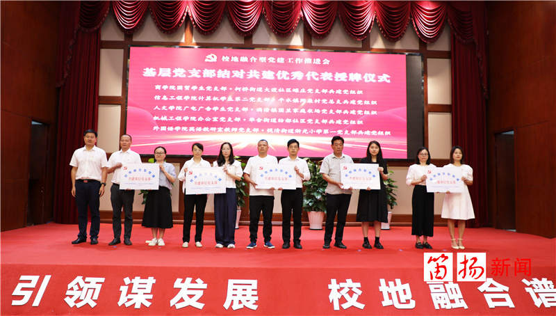 会议分享了校地融合型党建工作重大成果;为基层党支部结对共建优秀代表、基层党支部优秀育人共建基地代表、优秀志愿者团队代表授牌授旗;党建共同体代表作了交流发言。