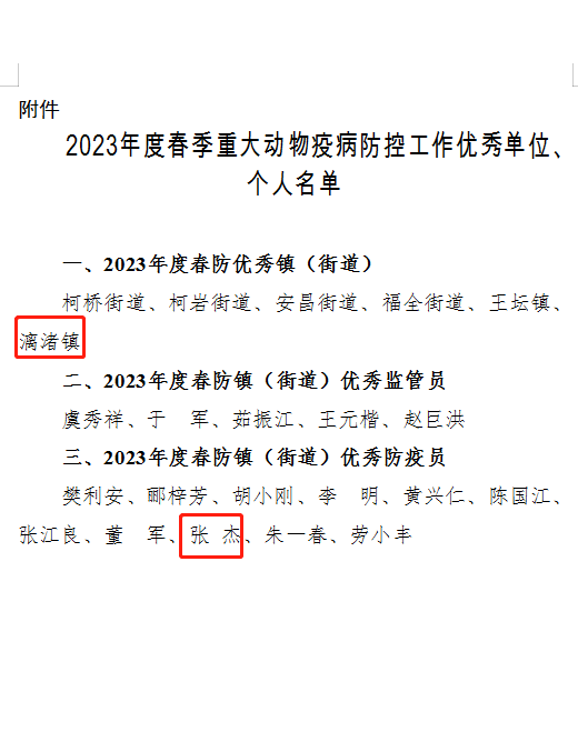 漓渚镇被评为2023年度春季重大动物疫病防控工作优秀单位,张杰被评为镇(街道)优秀防疫员。