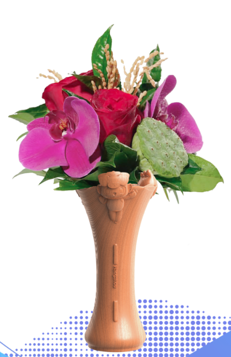 该花器取材榉木,质地较硬;高18公分,直径8公分。要制作7000多个一模一样、雕刻细腻的木雕件,并非易事。首先要通过机床定型,完成粗加工、精加工,确保尺寸一致;再用手工精雕细刻,细化各个部位。花觚瓶口为起伏的水纹,取自浙江山水诗意的韵律之美;上方雕有琮琮、宸宸、莲莲三个吉祥物,头部为圆雕,身体为浮雕;花觚经线阴刻“Hangzhou”的文字标识。整体设计充分考虑人体工程学的尺寸感,从比例、尺寸、手感上呈现“精致的感受力”,兼具美感与实用。