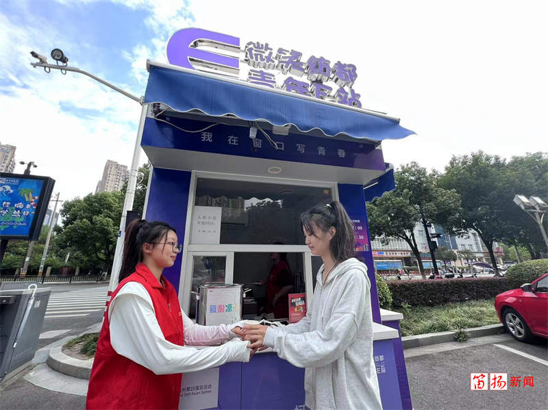为过往的路人提供乘凉场地、喝茶、借伞、指路等服务。来自浙江工业大学之江学院的绍兴籍学生王迪楠的这个暑假有点不一样。除了在学校和在家,从早上9点到下午4点半,她把更多时间花在了位于柯桥新华书店附近的青年E站里。